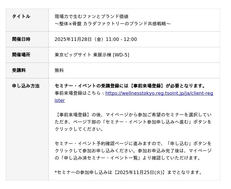 【Wellness Tokyo 2025】整体×骨盤 カラダファクトリーのブランド共感戦略!現場力で生むファンと「ブランド価値」セミナーを2025年11月28日(金)に開催