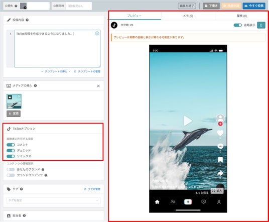 TikTok投稿機能・全アカウント一括分析機能 概要動画の投稿業務を効率化し、投稿ミスなどのリスクを軽減今回の投稿機能の追加によって、数秒から最大10分の動画のオーガニック投稿が可能です。管理画面上で動画やハッシュタグ、メンションをセットし、見映え(プレビュー)をチェックすることができます。また、視聴者(TikTokユーザー)に許可する項目として「コメント」「デュエット」「リミックス」を選択することができ、企業アカウントの運用方針に沿って管理いただけます。予約投稿や承認機能(最大三段階)を活用いただくことで、投稿業務の効率化および投稿ミスの防止を軽減いたします。