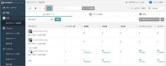 効率的にフォロワー数や投稿の反応に関する各種指標の分析が可能に全アカウント一括分析機能の追加によって、登録されているアカウントのフォロワー数、投稿数、反応数/率(※3)、エンゲージメント数/率(※4)、動画再生数の数値を一括で確認いただけます。例えば、複数アカウントを運用している場合、「店舗やブランドごとに運用が適切に行われているか」などを一括で確認することが可能です。アカウントの目標に合わせて、表示する指標のカスタマイズも可能です。