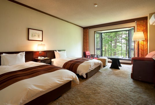 樹々に囲まれた「蓼科東急ホテル」(上)、ホテルの一室からも豊かな自然を眺めることができます。