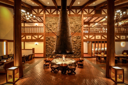 ガーデンエリアにあるテラス席でお話しくださった鈴木様(上)、「蓼科東急ホテル」には、ロビーを抜けた先に大きな趣がある暖炉があります。