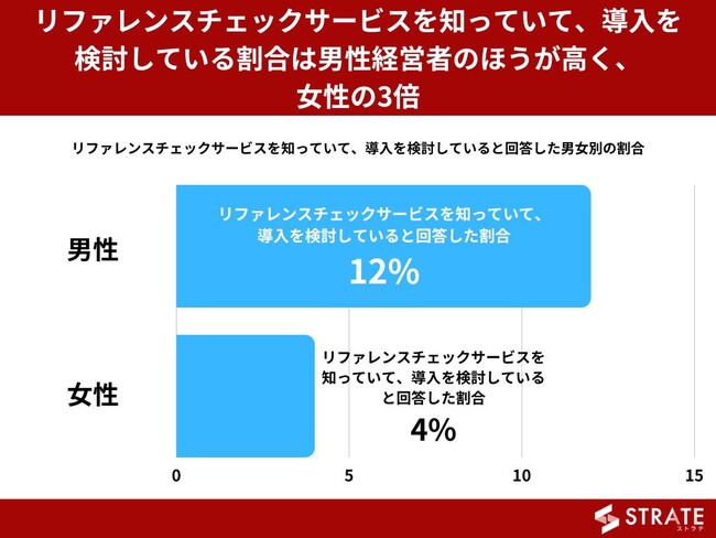 【リファレンスチェックサービスを知っていて、導入を検討している割合は男性経営者のほうが高く、女性の3倍】