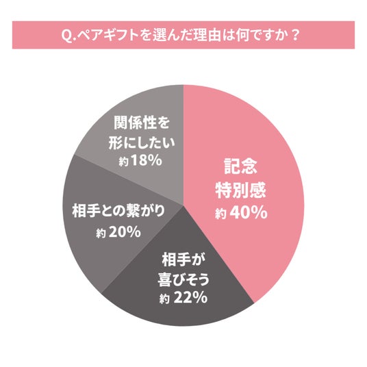 前問にて【ペアギフトを贈ったことがある】と回答した方を対象に「ペアギフトを選んだ理由は?」と質問したところ、ペアギフトを選ぶ理由として最も多かった理由は「記念感・特別感を出したかった」(約40%)でした。