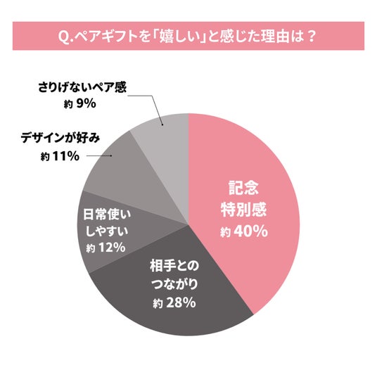 前問で「嬉しい」「嬉しいが少し気恥ずかしい」と回答した方を対象に理由を尋ねたところ、「記念感・特別感」(約40%)が最も高く、次いで「つながりを感じられた」(約28%)が続きました。感情的価値が重視される一方で、「日常的に使いやすい」「さりげないペア感」など実用性や控えめなデザインも一定の支持を集めており、“特別感×使いやすさ”のバランスが満足度を左右する傾向が見られます。