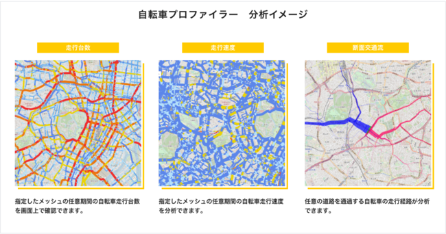 まずは過去の自転車走行状況の可視化を目的に、自転車通行台数、速度、走行経路の3つの分析機能を実装いたします。今後はより便利にご利用いただけるよう機能拡充を行い、更なるサービスの向上に努めてまいります。