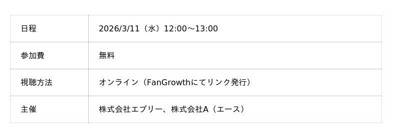 株式会社A(読み:エース、代表取締役CEO 中嶋泰、以下当社)は、独自のIP調査やファンデータを活用した企画を強みとするマーケティング支援を提供する株式会社エブリー(東京都港区、代表 吉田大成、以下エブリー社)と共催で【無料ウェビナー】「なぜ人気インフルエンサーを起用しても失敗するのか ―『成果の差』を生むインフルエンサーマーケの鉄則」 を3/11(水)12:00~13:00に開催することをお知らせします。