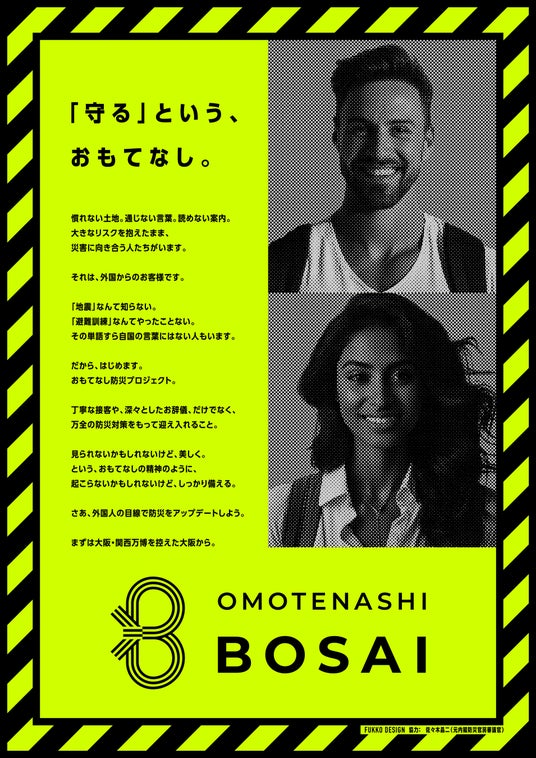 2025年4月13日から大阪・関西万博が開催され、訪日外国人の来場は約350万人が見込まれています。大阪の街では、観光地などで外国語の表記などが増えてきた一方、防災に対する表記はまだ十分とは言えない状況です。万博開催を300日前に控え、多くの訪日外国人を迎え入れる大阪市では、防災対策を強化していく必要があります。南海トラフ巨大地震発生後、最短で1時間50分で1mを超える津波が大阪市に到達すると想定されており、特に港区を含む湾岸地域で津波による浸水被害が発生する可能性が高いため、事前の周知が必要とされています。そこで、FUKKO DESIGN及びTBWA HAKUHODOと大阪市港区役所はプロジェクトチームを結成し、「おもてなし防災」として公民連携で訪日外国人の皆様の防災意識の向上に取り組んでいきます。