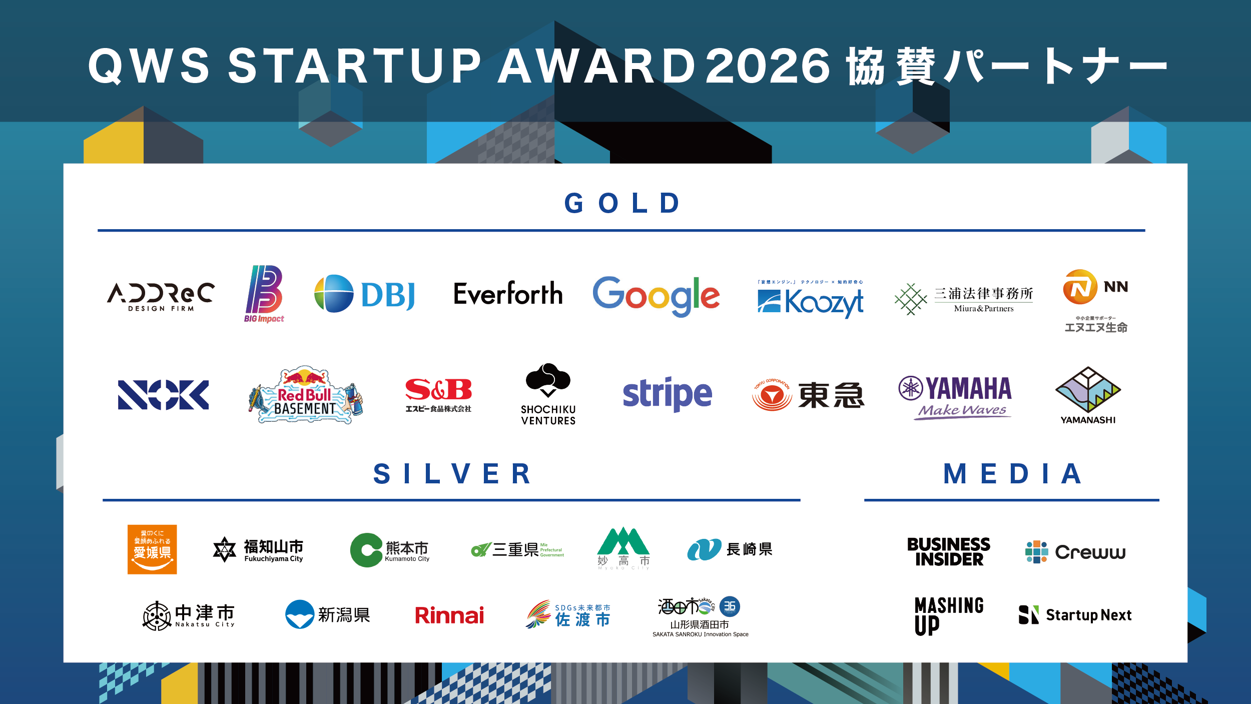 QWS STARTUP AWARD 2026に、協賛パートナーとして以下の企業・自治体、メディアの皆様が参画され、賞品や事業共創機会の提供をいただきます。審査を務めるエンジェル投資家やベンチャーキャピタリストに加え、企業・自治体、メディアと多様なステークホルダーが一体となってスタートアップを応援していきます。