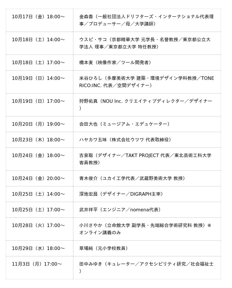 今回登壇するのは、デザイナーやクリエイターをはじめ、ミュージアム・エデュケーター、元小学校教員、文化人類学者など、多様なバックグラウンドを持つ14名。それぞれが現場で向き合ってきた「問い」、試行錯誤のプロセス、不確実性との向き合い方を語ります。
