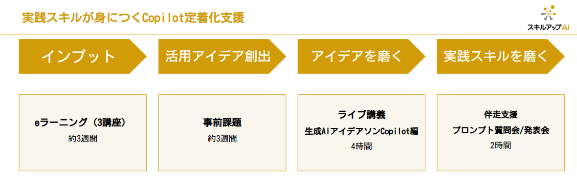eラーニングでMicrosoft 365 Copilot活用に必要な知識を身につけることで揺るぎない土台を築き、次のステップであるライブ講義や実践演習にスムーズに繋げることができます。
