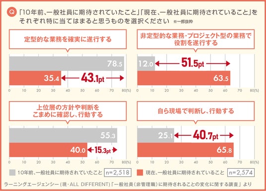市場ニーズや外部環境の変化に伴い、社員が組織から期待されることは大きく変化しています。当社で実施した調査(*2)によると、一般社員に期待されていることの中身は、10年前と現在とで大きく異なる結果となりました。例えば、下記の図の通り、10年前は「定型的な業務を確実に遂行する」「上位層の方針や判断をこまめに確認し、行動する」ことが求められていましたが、現在は「非定形的な業務・プロジェクト型の業務で役割を遂行する」「自ら現場で判断し、行動する」ことが求められるようになりました。