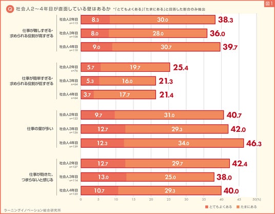 最後に、仕事が飽きた、つまらないと感じた割合を比較すると、社会人2年目は42.4%、社会人3年目は38.0%、社会人4年目は40.0%となりました。前年の調査結果(*3)でも、社会人2年目が仕事に対して最も飽きを感じていることがわかり、今回も同様の結果となりました。(図1)
