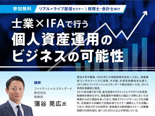 ファイナンシャルスタンダード株式会社取締役 蒲谷 晃広氏明治大学卒業後、2006年に大和証券株式会社へ入社し、資産運用コンサルティングに従事。その後、外資系保険会社を経て、2013年にファイナンシャルスタンダード株式会社へ入社。2016年同社取締役に就任。2015年以降で計7回、楽天証券IFAサミットにてTOP10を受賞。取締役を務めながら、資産運用や相続など幅広い分野においてお客様からのご相談を承っており、現役でアドバイザーとしても活躍中。北海道から沖縄まで全国各地でセミナー講師としても活躍しており、同社が行う大好評の「投資選びの新常識セミナー」は開催回数500回を超え、延べ20,000人以上が参加している。