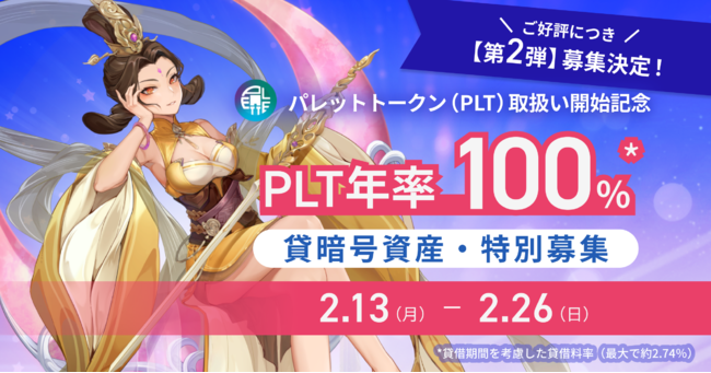 フォビジャパン株式会社(本社:東京都港区、代表取締役:関 磊、以下「フォビジャパン」)は、ご好評につき、2023年2月13日(月)より、パレットトークン(PLT)の貸暗号資産(貸借期間:10日、年率100%*)の特別募集(第2弾)を開始いたします。