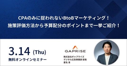 デジタルビジネス支援を行う、海外SaaS商社の株式会社ギャプライズ(本社:東京都千代田区、代表取締役 CEO:甲斐 亮之、以下「当社」)は、3月14日(木)13時より、「CPAのみに捉われないBtoBマーケティング~成果に繋げる施策評価方法から予算配分のポイントまで一挙ご紹介~」と題しました