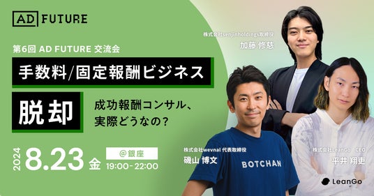 「手数料/固定報酬ビジネスからの脱却 成功報酬コンサル実際どうなの?」をテーマに業界の最前線で活躍するプロによるトークセッション・勉強会を8月23日に開催いたします!
