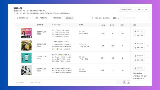 ミショナ株式会社ミショナが提供するInstagram(インスタ)自動化ツール「エルグラム」では投稿済み画像・動画のキャプション・いいね・コメント・保存・シェア・リーチ・エンゲージメントの確認と分析ができます。