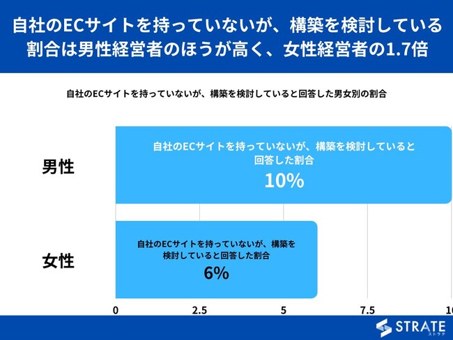 【自社のECサイトを持っていないが、構築を検討している割合は男性経営者のほうが高く、女性経営者の1.7倍】