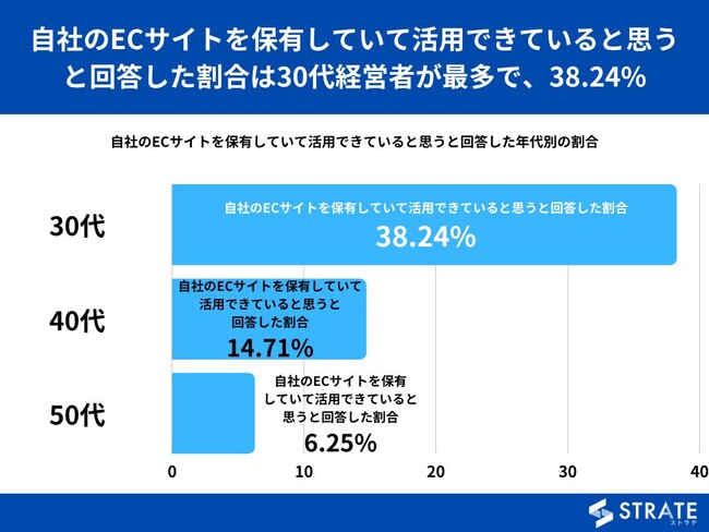 【自社のECサイトを保有していて活用できていると思うと回答した割合は30代経営者が最多で、38.24%】