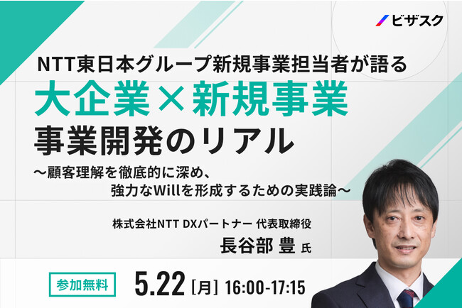 「知見と、挑戦をつなぐ」をミッションにグローバルなナレッジプラットフォームを運営する株式会社ビザスク(以下、当社)は、「顧客理解を徹底的に深め、強力なWillを形成するための実践論」をテーマに、株式会社NTT DXパートナー 代表取締役の長谷部 豊氏のご登壇による無料オンラインセミナーを、5/22(月)16時より開催します。