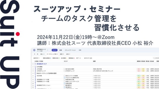 株式会社スーツ(所在地:東京都千代田区、代表取締役社長CEO:小松 裕介)は、2024年11月22日(金)19時から、当社代表の小松が講師を務めるスーツアップ・セミナー「チームのタスク管理を習慣化させる」を無料開催します。