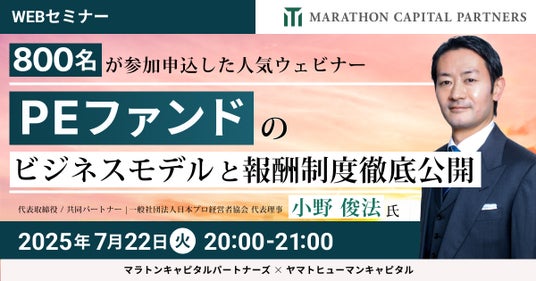 ヤマトヒューマンキャピタル株式会社(本社:東京都千代田区、代表取締役:堀江 大介)は、2025年7月22日(火) 20:00よりオンラインにて、マラトンキャピタルパートナーズ株式会社 代表取締役/共同パートナー/一般社団法人日本プロ経営者協会代表理事の小野 俊法氏にご登壇いただくウェビナー『PEファンドのビジネスモデルと報酬制度徹底公開』を開催いたします。