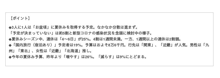 一方で、シーズン中に「連休の予定はない」人も1割ほど存在した。そして、連休の予定についても「予定は決まっていない」が3割と、夏休みの取得そのものや時期について決め切れていない様子がうかがえる。【図表2】