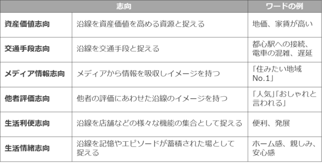利用者の「沿線」に対するイメージは、資産価値志向、交通手段志向、メディア情報志向、他者評価志向、生活利便志向、生活情緒志向の6つに類型化できることが明らかに
