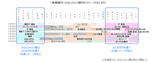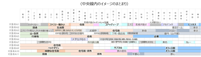 インタビュー対象者19名に「沿線」の中でのイメージのまとまりを聴取したところ、「沿線」の中でいくつかのまとまりで捉えられ、まとまりに対しそれぞれのイメージを持っていることがわかった。中央線に比べると、東横線は、まとまりが共通しており、イメージも共通していた。