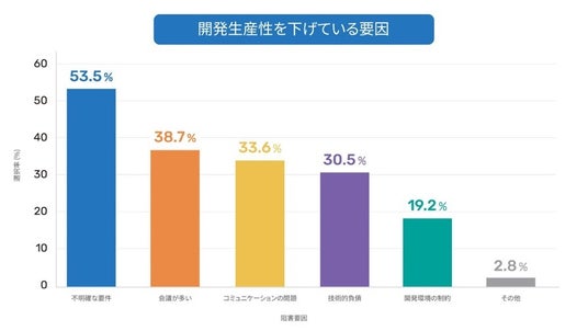 また、開発生産性における主要な課題は、技術的な問題よりも組織運営に起因するものが多いことが明らかとなりました。実際に、53.5%のエンジニアが「要件定義の不明確さ」を最重要課題として挙げており、こうした構造的な問題が、納期の遅延、成果物の品質低下、開発リソースの非効率な配分といった形で、現場に恒常的な影響を及ぼしています。