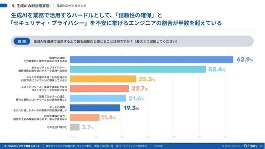 理由としては、「信頼性の確保」や「セキュリティ・プライバシー」に対する不安を抱えるエンジニアは過半数を超えており、これらが企業における本格的なAI導入を阻む要因となっていることがうかがえます。