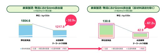 本実証の結果、従来品から「水田雑草 テーラーメイド防除(R)」への切り替えにより、製品の生産プロセスにおけるGHG排出量を約3割削減することがわかりました。特に高濃度製剤によるボトルの小型化が、物流面における削減に大きく効果を及ぼし、今後の高濃度製剤への切り替えによる削減効果が期待される結果が示されました。