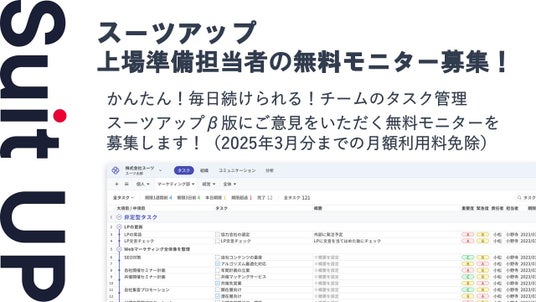 株式会社スーツ(所在地:東京都千代田区、代表取締役社長CEO:小松 裕介)は、チームでかんたん、毎日続けられるプロジェクト・タスク管理ツールの経営支援クラウド「Suit UP」(スーツアップ)の上場準備担当者の無料モニターを募集いたします。