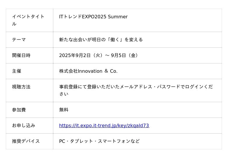 デジタルマーケティング支援事業を展開する株式会社ニュートラルワークス(本社:藤沢市、代表取締役:三木五月、以下「ニュートラルワークス」)は、株式会社イノベーション(東証グロース 証券コード3970)のグループ会社である、株式会社Innovation & Co.(本社:東京都渋谷区、代表取締役社長:齊藤和馬、以下「Innovation & Co.」)が主催する業界最大級のオンライン展示会「ITトレンドEXPO2025 Summer」に出展します。