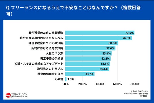 「Q.フリーランスになるうえで不安なことはなんですか?(複数回答可)」(n=569)と質問したところ、「案件獲得のための営業活動」と「自分自身の専門的なスキルレベル」がそれぞれ79.4%、76.8%と非常に多い回答率を得ました。