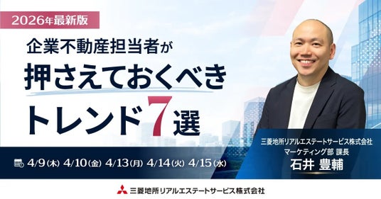 不動産総合コンサルティング会社の三菱地所リアルエステートサービス株式会社(本社:東京都千代田区)は、総務・管財・経営企画・財務など不動産施策に関わるご担当者様向けにオンラインセミナー『【2026年最新版】企業不動産担当者が押さえておくべきトレンド7選』を4月9日・10日・13日・14日・15日に開催します。