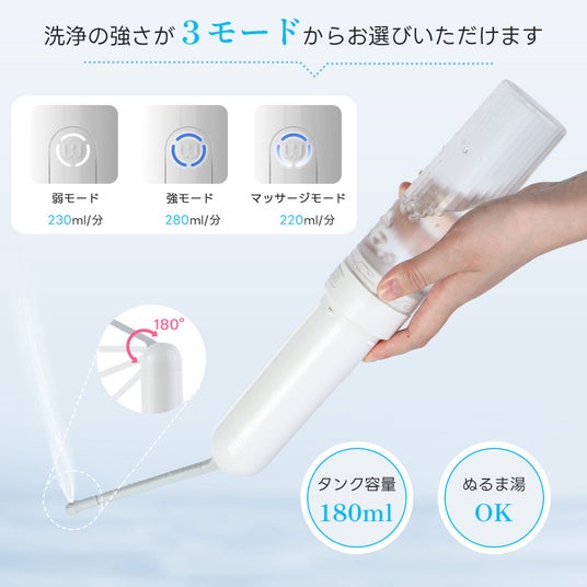 ■ 【3段階モード+記憶機能】あなたに合わせた快適さを水圧は「弱・強・マッサージ」の3モードから選択可能。赤ちゃんや高齢者にはやさしい“弱モード”、しっかり洗いたい時は“強モード”など、用途に合わせて選べます。さらに、前回の設定を記憶する便利な記憶機能付き。