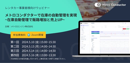ダイナミックプライシングを始めとし、観光業界のDX化や集客支援を行うメトロエンジン株式会社(本社:東京都品川区、代表取締役CEO:田中良介、以下メトロエンジン)は、レンタカー事業者向けに5月の10日(金)・13日(月)・14日(火)・16日(木)の4日程でセミナーを開催し、予約サイトの在庫の一元管理及び自動管理を実現できるシステム『メトロコンダクター』をご紹介します。