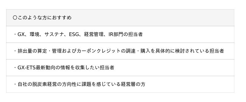 https://peatix.com/event/4474461本セミナーは、成長志向型カーボンプライシング(GX-ETS)の概要から、排出量取引(GX-ETS Phase2)の最新動向、カーボンクレジットの市場動向や創出方法など、情報開示や環境への対策が企業経営に与える影響などについて、業界の第一線で活躍する専門家が登壇します。