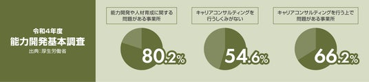 キャリアコンサルティング施策に特化してみると、仕組みがない事業所が54.6%、仕組みはあるが運用上問題がある事業所は66.2%となり、人的資本経営に欠かせない「育成」や「キャリア自律」に関して、未だに多くの課題があることがうかがえます。