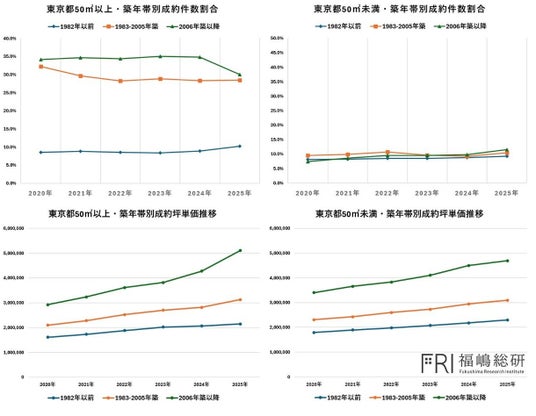 一方で、50平方メートル 未満の各セグメントでは成約件数の割合が上昇しています。東京都ではすべてのセグメントで成約坪単価が上昇しているため、最も坪単価の高い築浅・高面積帯の比率が下がっても、平均坪単価自体は上昇する結果となりました。ここには、価格上昇の裏側で起きている需要の質的変化、すなわち「どの価格帯で、どのような物件が選ばれているのか」という構造変化が表れています。