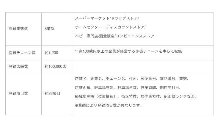 2.i-Store DB:インテージが独自に収集整備した、全国小売チェーンの位置情報付き店舗データベース。所在地、電話番号、売場面積、駐車場台数、営業時間などの基本項目、さらに店舗商圏データからグルーピングした街区・居住者特性などの付帯項目を収録しています。