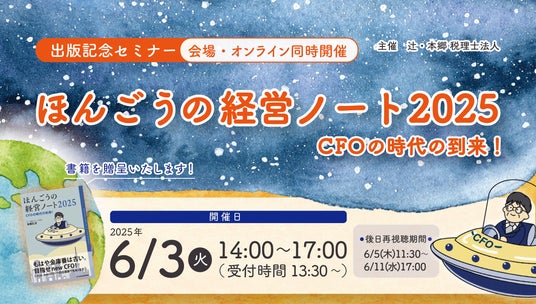 辻・本郷 税理士法人(本社:東京都新宿区、理事長:桑木小恵子)は、2025年6月2日(火)より「ほんごうの経営ノート2025 出版記念セミナー~CFOの時代の到来~」を開催いたします。国内最大規模の税理士法人の生みの親であり、50年近く経営に携わってきた本郷孔洋が、バランスシート戦略が経営の要となった昨今、『CFOが経営の主役の時代が来る!』を今年のワードに語りつくします。 当日参加が難しい方のために、6月5日(木)11時30分~6月11日(水)17時00分まで当日の模様のアーカイブ動画も配信いたします。