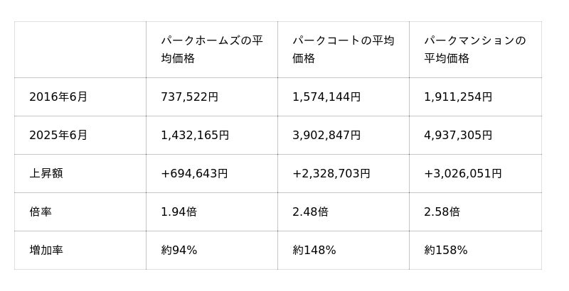 特にステータスが高いシリーズほど上昇率が高く、パークコートとパークマンションは約2.5倍の価格上昇を記録しました。