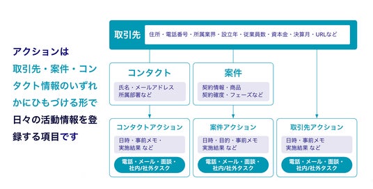 Mazricaは「取引先」「案件」「コンタクト」「アクション」という、大きく分けて4種類のデータで構成されます。そのうちの営業活動の活動情報である「アクション」は取引先・案件・コンタクトのいずれかに紐づいて管理されます。