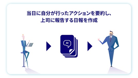 - その日に行った顧客とのコミュニケーション内容を要約し、指定されたフォーマットで日報の下書きを自動で作成できます。