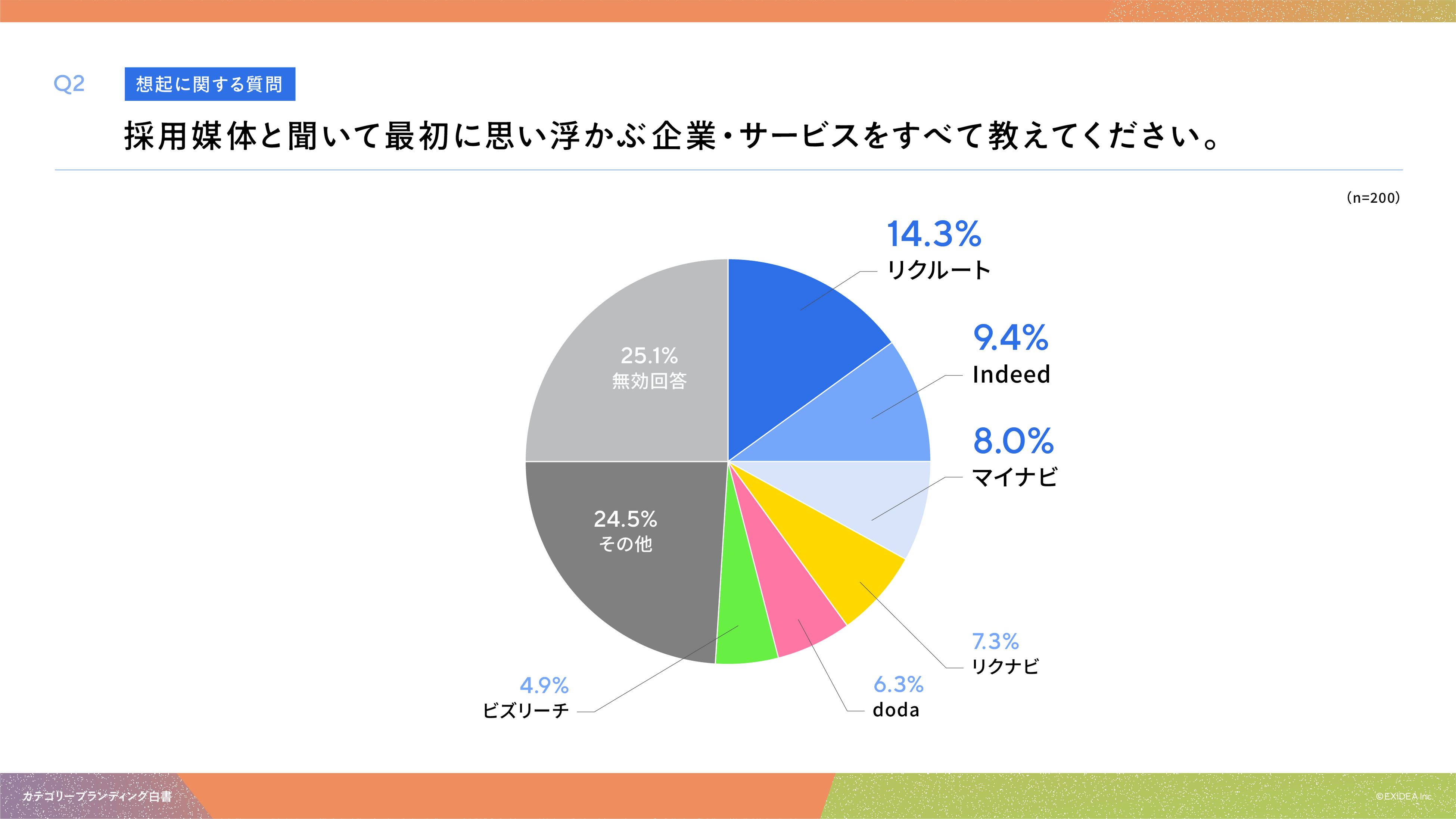 「Q2. 採用媒体と聞いて最初に思い浮かぶ企業・サービスをすべて教えてください。(自由回答)」(n=200)と質問したところ、リクルートが14.3%、Indeedが9.4%、マイナビが8.0%という回答となりました。