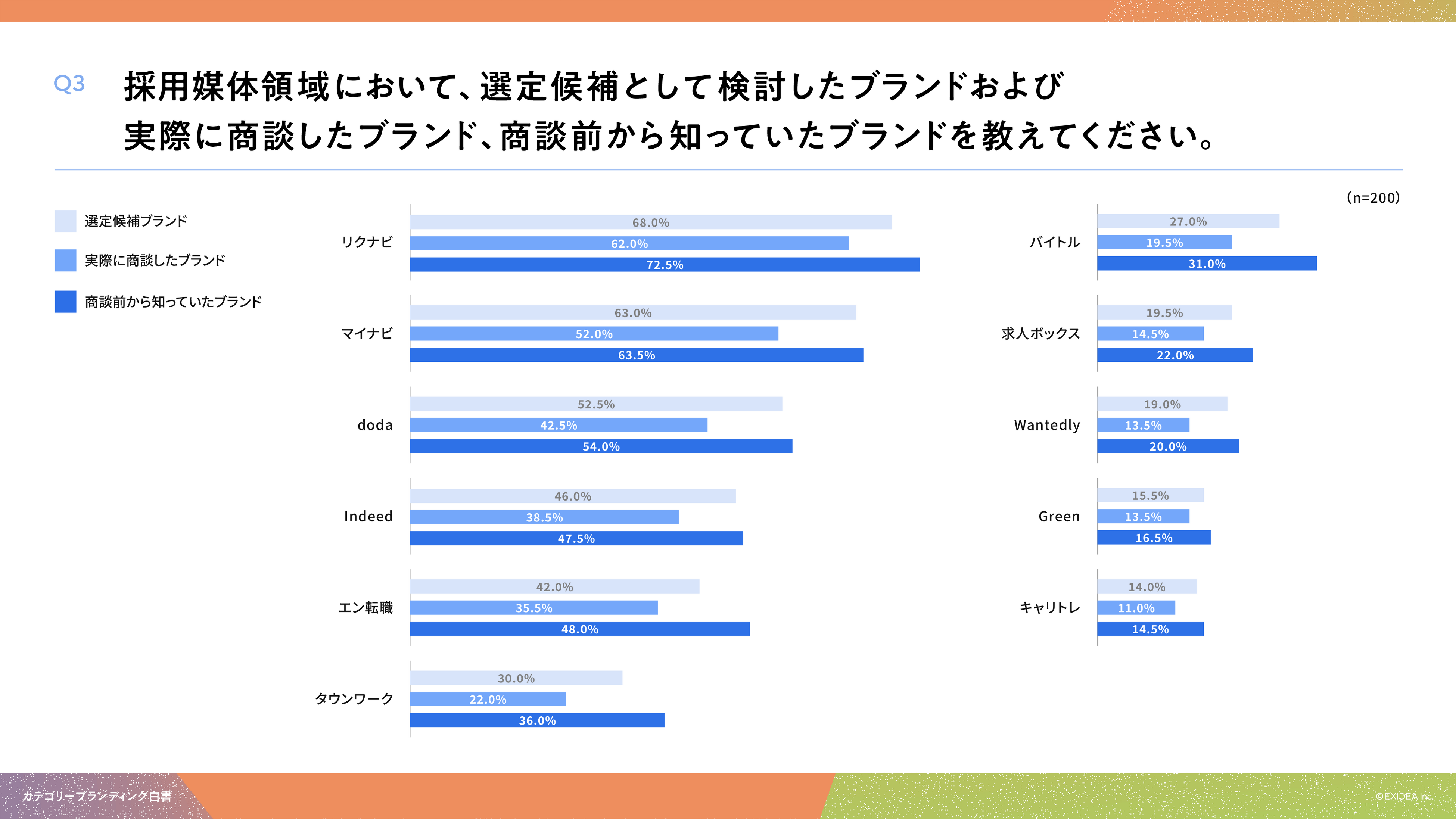 「Q3. 採用媒体領域において、選定候補として検討したブランドおよび実際に商談したブランド、商談前から知っていたブランドを教えてください。」(n=200)と質問したところ、選定候補ブランドは「リクナビ」が68.0%、実際に商談したブランドは「リクナビ」が62.0%、商談前から知っていたブランドは「リクナビ」が72.5%という回答となりました。