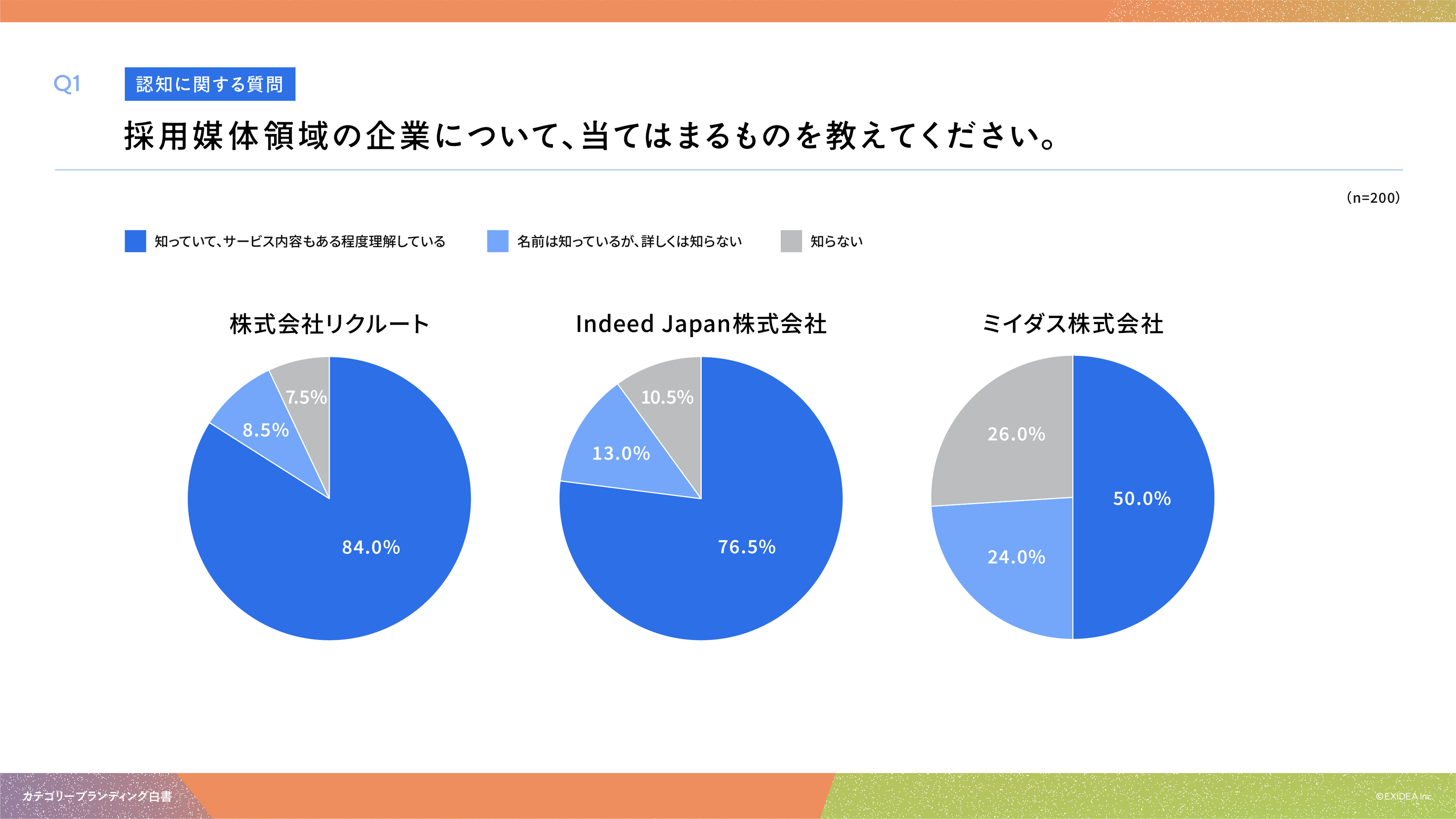 https://wa-concept.net「Q1. 採用媒体領域の企業について、当てはまるものを教えてください。」(n=200)と質問したところ、「知っていて、サービス内容もある程度理解している」という回答の割合について、株式会社リクルートが84.0%、Indeed Japan株式会社が76.5%、ミイダス株式会社が50.0%という結果となりました。