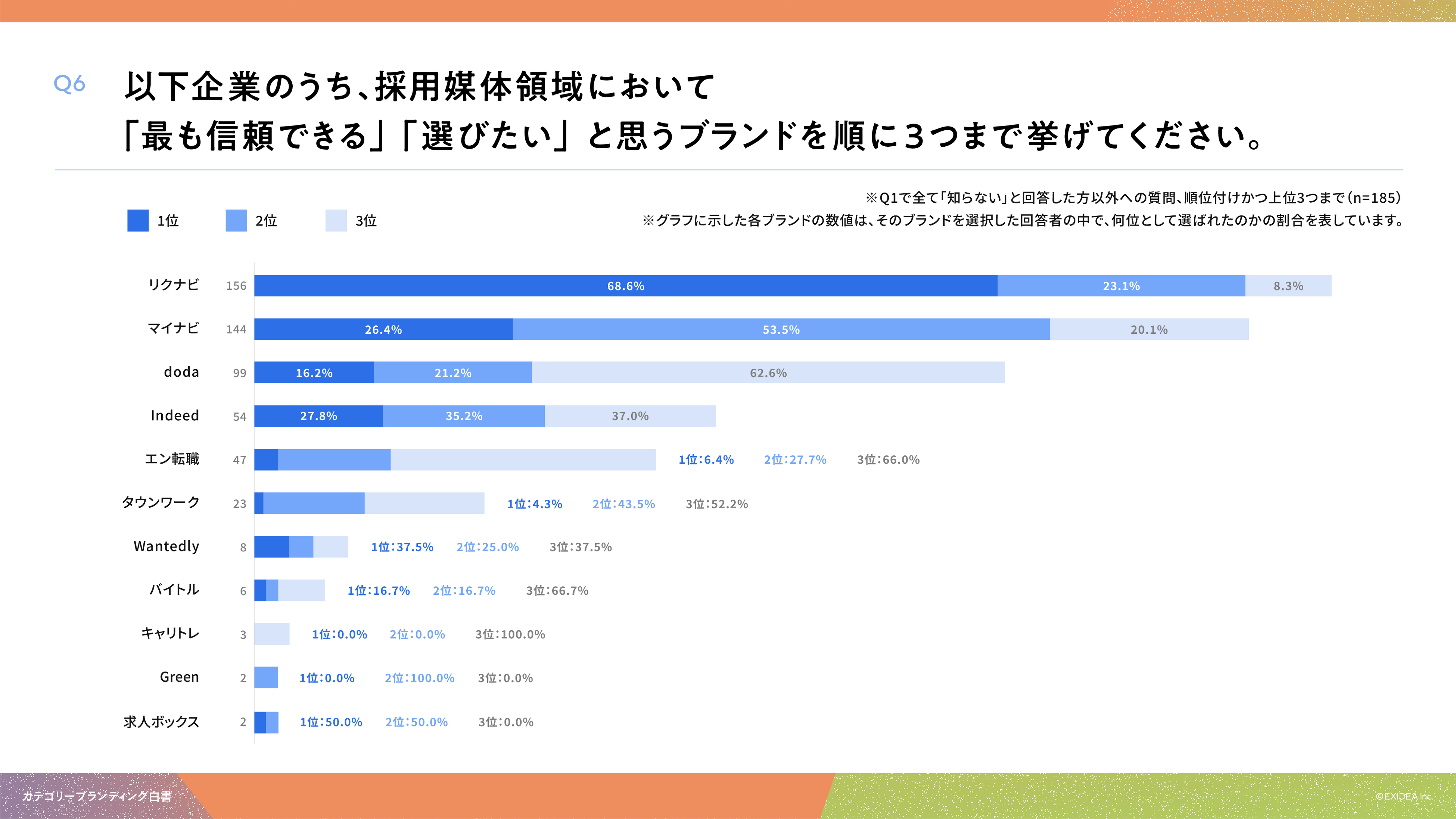 「Q6. Q1で全て「知らない」と回答した方以外にお聞きします。以下企業のうち、採用媒体領域において「最も信頼できる」「選びたい」と思うブランドを順に3つまで挙げてください(順位付けかつ上位3つまで)」(n=185)と質問したところ「1位率*」では、リクナビが68.6%、マイナビが26.4%、dodaが16.2%という回答となりました。